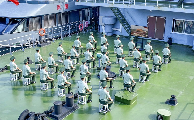 9月3日,武警江蘇總隊(duì)南京支隊(duì)船艇大隊(duì)官兵觀看紀(jì)念中國(guó)人民抗日戰(zhàn)爭(zhēng)暨世界反法西斯戰(zhàn)爭(zhēng)勝利80周年大會(huì)直播。