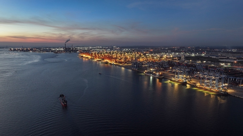 9月4日,海輪??繗J州港集裝箱自動化碼頭裝卸集裝箱(無人機(jī)照片)。