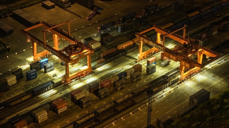 欽州鐵路集裝箱中心站塔吊在為貨列裝運集裝箱(9月4日攝,無人機(jī)照片)。