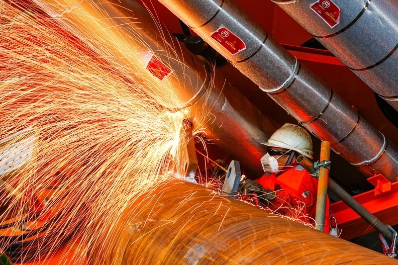 9月8日,工人在墾利6-1油田10-1北區(qū)塊Ⅱ期開發(fā)項目油氣平臺安裝作業(yè)現(xiàn)場進行切割作業(yè)。