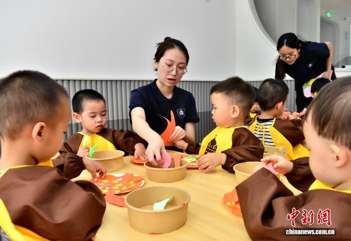 7月29日,福州新星托育園東街園老師指導(dǎo)小朋友進(jìn)行藝術(shù)創(chuàng)想,制作美味的“披薩”。近年來,當(dāng)?shù)胤e極推動(dòng)公辦幼兒園和社會(huì)力量興辦發(fā)展托育教育服務(wù),以解決民眾“帶娃難”的問題。 中新社記者 張斌 攝