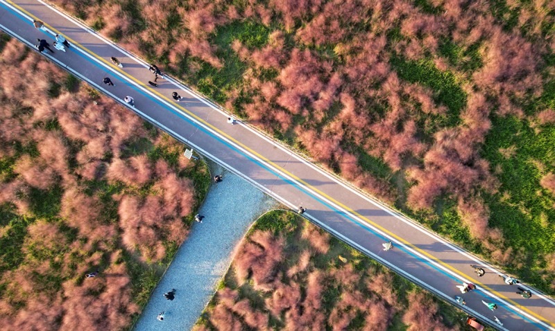 10月18日,游客在山東省東營市東營區(qū)耿井濕地粉黛亂子草“花?!迸恼沾蚩ǎo人機(jī)照片)。