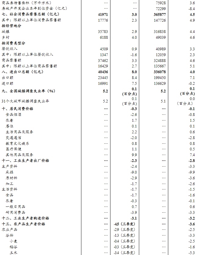 前三季度,全國固定資產(chǎn)投資(不含農(nóng)戶)371535億元,同比下降0.5%;扣除房地產(chǎn)開發(fā)投資,全國固定資產(chǎn)投資增長3.0%。分領(lǐng)域看,基礎(chǔ)設(shè)施投資同比增長1.1%,制造業(yè)投資增長4.0%,房地產(chǎn)開發(fā)投資下降13.9%。全國新建商品房銷售面積65835萬平方米,同比下降5.5%;新建商品房銷售額63040億元,下降7.9%。分產(chǎn)業(yè)看,第一產(chǎn)業(yè)投資同比增長4.6%,第二產(chǎn)業(yè)投資增長6.3%,第三產(chǎn)業(yè)投資下降4.3%。民間投資同比下降3.1%;扣除房地產(chǎn)開發(fā)投資,民間投資增長2.1%。高技術(shù)產(chǎn)業(yè)中,信息服務(wù)業(yè),航空、航天器及設(shè)備制造業(yè),計(jì)算機(jī)及辦公設(shè)備制造業(yè)投資同比分別增長33.1%、20.6%、7.4%。9月份,固定資產(chǎn)投資(不含農(nóng)戶)環(huán)比下降0.07%。