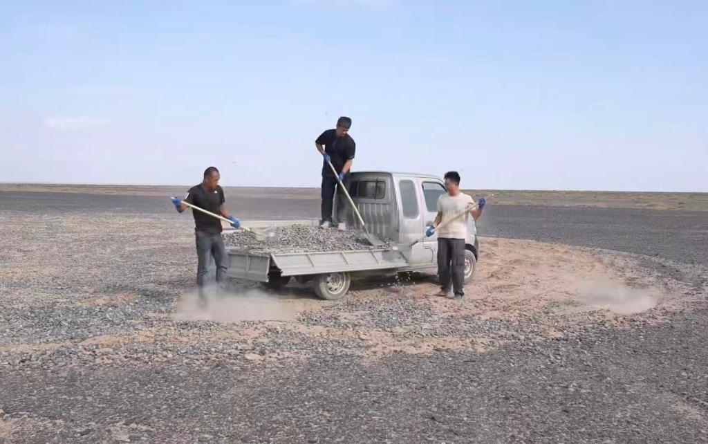 “看到車輪碾過標語那一刻,就像碾在歷史的脊梁上?!本W(wǎng)絡博主陸遙得知標語被破壞后,主動驅車兩千多公里,經(jīng)歷六天抵達哈密。他和朋友們拉運20噸砂石,才終于修復這些“疤痕”。