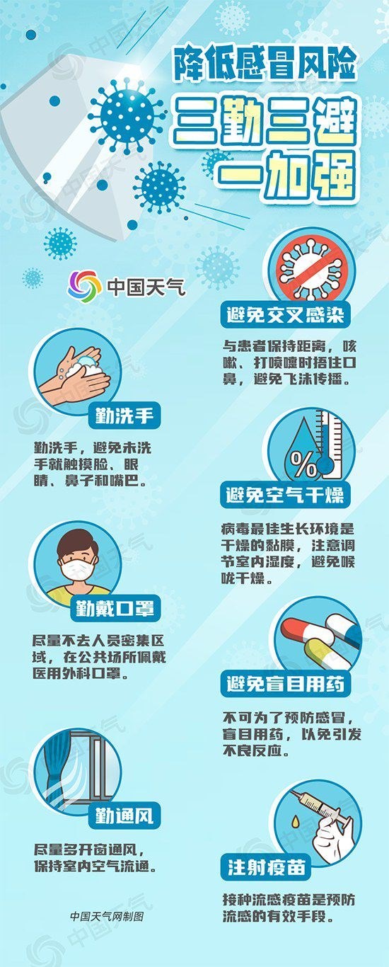 時值霜降時節(jié),正是秋冬季溫差最大的時期。加上近期冷空氣活動頻繁,氣溫起伏明顯,流感病毒傳播趨于活躍,感冒風(fēng)險顯著上升。如何科學(xué)預(yù)防感冒?中國天氣網(wǎng)總結(jié)了“三勤三避一加強”防御口訣,幫你筑牢健康防線。