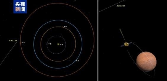 △星際天體阿特拉斯與天問一號火星環(huán)繞器相對位置示意圖(右圖是2025年10月3日相機(jī)拍攝時左圖的局部放大)