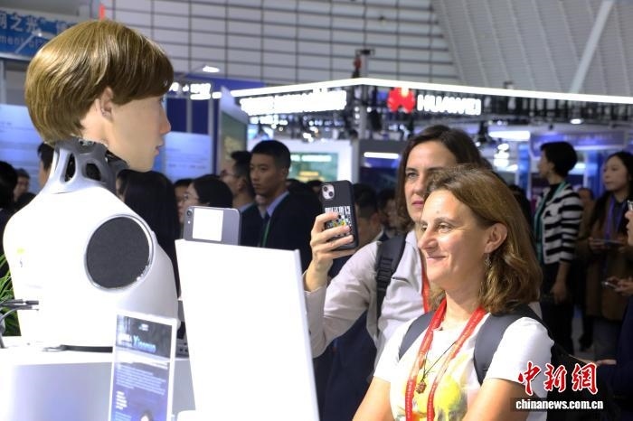 11月6日,2025年“互聯(lián)網(wǎng)之光”博覽會(huì)現(xiàn)場,國際嘉賓與機(jī)器人互動(dòng)。胡豐盛 攝
