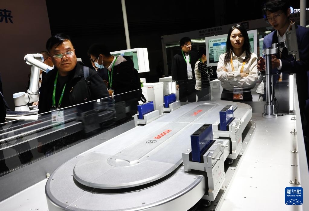 11月6日,參觀者在博世公司展臺(tái)展出的LeTrak磁驅(qū)傳輸系統(tǒng)展品旁駐足觀看,這是該產(chǎn)品的全球首發(fā)。