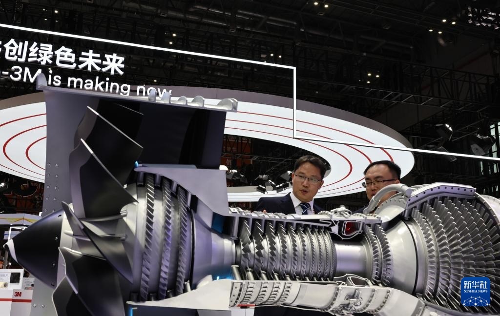 11月5日,參觀者在通用電氣展臺(tái)展出的一款LEAP-1C發(fā)動(dòng)機(jī)模型前交流討論,這也是該型號(hào)發(fā)動(dòng)機(jī)的中國(guó)首展。