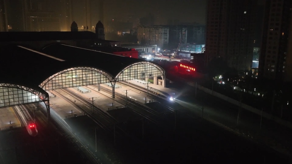 15日凌晨5時,漢口站站臺上,已裝袋的服裝、生鮮、電子產(chǎn)品等10噸快件有序擺放,鐵路工作人員正將包裹搬進高鐵車廂。