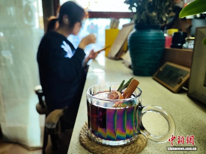 11月19日,在天津三七開(kāi)咖啡酒館,一款以紅酒為基底,搭配香橙清甜與肉桂醇香的熱飲熱銷?!≈行律缬浾?佟郁 攝
