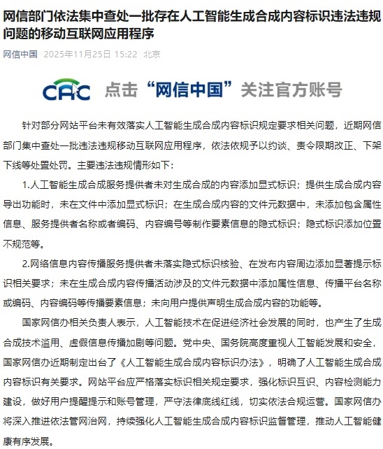 針對部分網(wǎng)站平臺未有效落實人工智能生成合成內容標識規(guī)定要求相關問題,近期網(wǎng)信部門集中查處一批違法違規(guī)移動互聯(lián)網(wǎng)應用程序,依法依規(guī)予以約談、責令限期改正、下架下線等處置處罰。主要違法違規(guī)情形如下:
