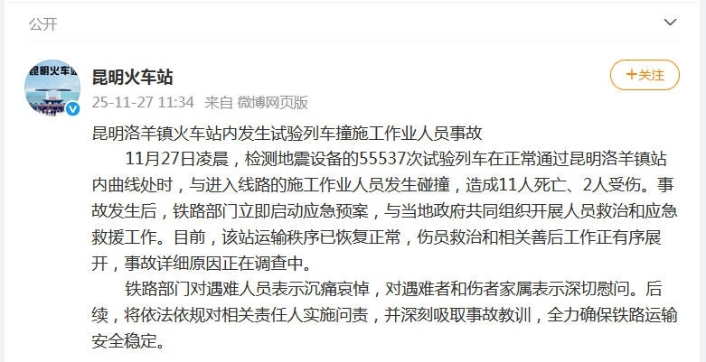 據(jù)昆明鐵路局昆明站官方微博消息,11月27日凌晨,檢測地震設(shè)備的55537次試驗列車在正常通過昆明洛羊鎮(zhèn)站內(nèi)曲線處時,與進入線路的施工作業(yè)人員發(fā)生碰撞,造成11人死亡、2人受傷。事故發(fā)生后,鐵路部門立即啟動應(yīng)急預(yù)案,與當?shù)卣餐M織開展人員救治和應(yīng)急救援工作。目前,該站運輸秩序已恢復(fù)正常,傷員救治和相關(guān)善后工作正有序展開,事故詳細原因正在調(diào)查中。