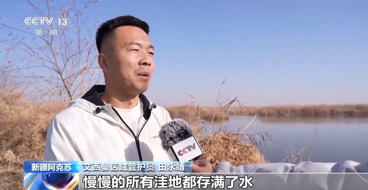 艾西曼區(qū)域管護(hù)員 田永靖:再生水過來之后,慢慢所有洼地都存滿了水,變成了現(xiàn)在所看到的濕地,這一大片的蘆葦現(xiàn)在長勢都特別不錯。
