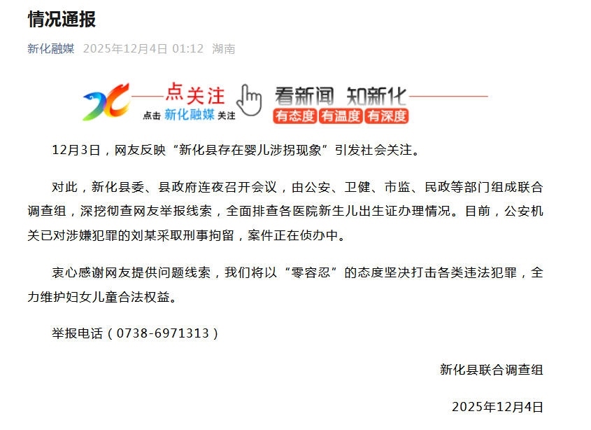 中新網(wǎng)12月4日電 針對網(wǎng)友反映的“新化縣存在嬰兒涉拐現(xiàn)象”,湖南省婁底市新化縣聯(lián)合調(diào)查組12月4日發(fā)布情況通報(bào)稱,新化縣委、縣政府連夜召開會議,由公安、衛(wèi)健、市監(jiān)、民政等部門組成聯(lián)合調(diào)查組,深挖徹查網(wǎng)友舉報(bào)線索,全面排查各醫(yī)院新生兒出生證辦理情況。