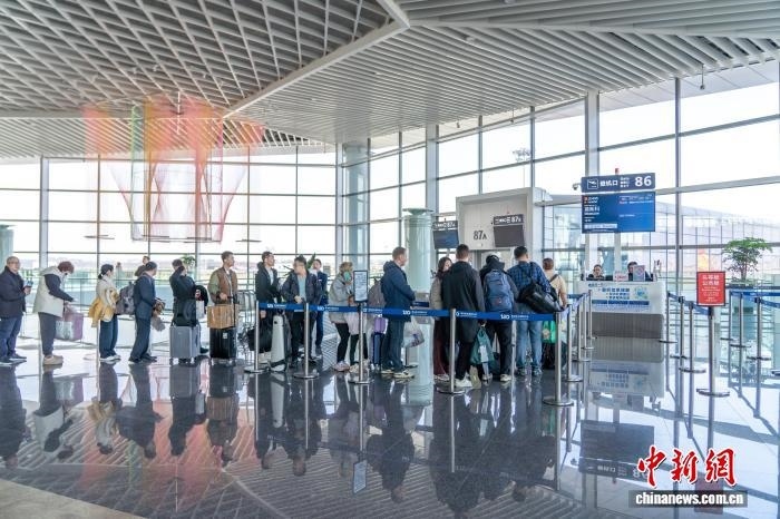 國際旅客在青島機場排隊準(zhǔn)備登機。(青島機場供圖)