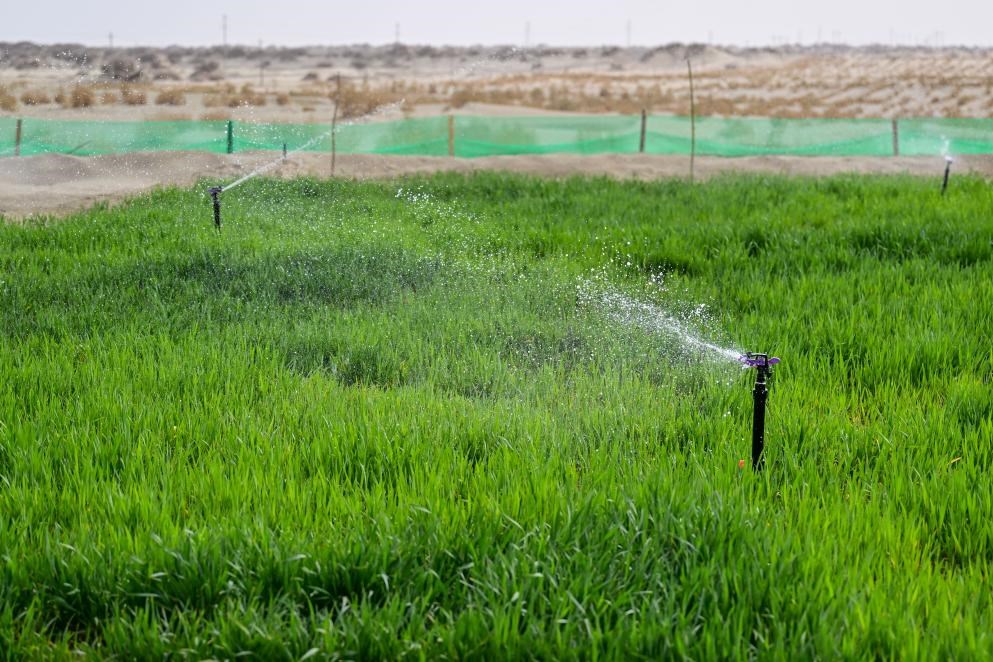 2025年4月13日,新疆阿克蘇地區(qū)沙雅縣沙生經(jīng)濟(jì)作物發(fā)展試驗(yàn)基地,經(jīng)過苦咸水淡化技術(shù)處理的地下水噴灌出的小麥長勢(shì)良好。新華社記者丁磊 攝
