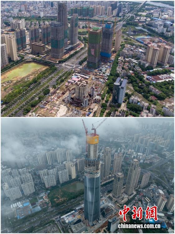 2025年12月18日,海南自由貿(mào)易港正式啟動(dòng)全島封關(guān)。近年來,海南自貿(mào)港建設(shè)在利好政策帶動(dòng)下不斷刷新“自貿(mào)港速度”,一個(gè)個(gè)重大項(xiàng)目、重點(diǎn)園區(qū)拔地而起,直觀呈現(xiàn)海南自貿(mào)港的蓬勃生機(jī)。這里正成為中國對外開放的新前沿、互利合作的新熱土和推動(dòng)經(jīng)濟(jì)全球化的新引擎。上資料圖為2020年8月21日因故停工的“海南第一高樓”海南中心項(xiàng)目,下資料圖為2025年12月16日海南中心項(xiàng)目順利完成塔樓核心筒結(jié)構(gòu)封頂。(拼版圖,無人機(jī)照片)