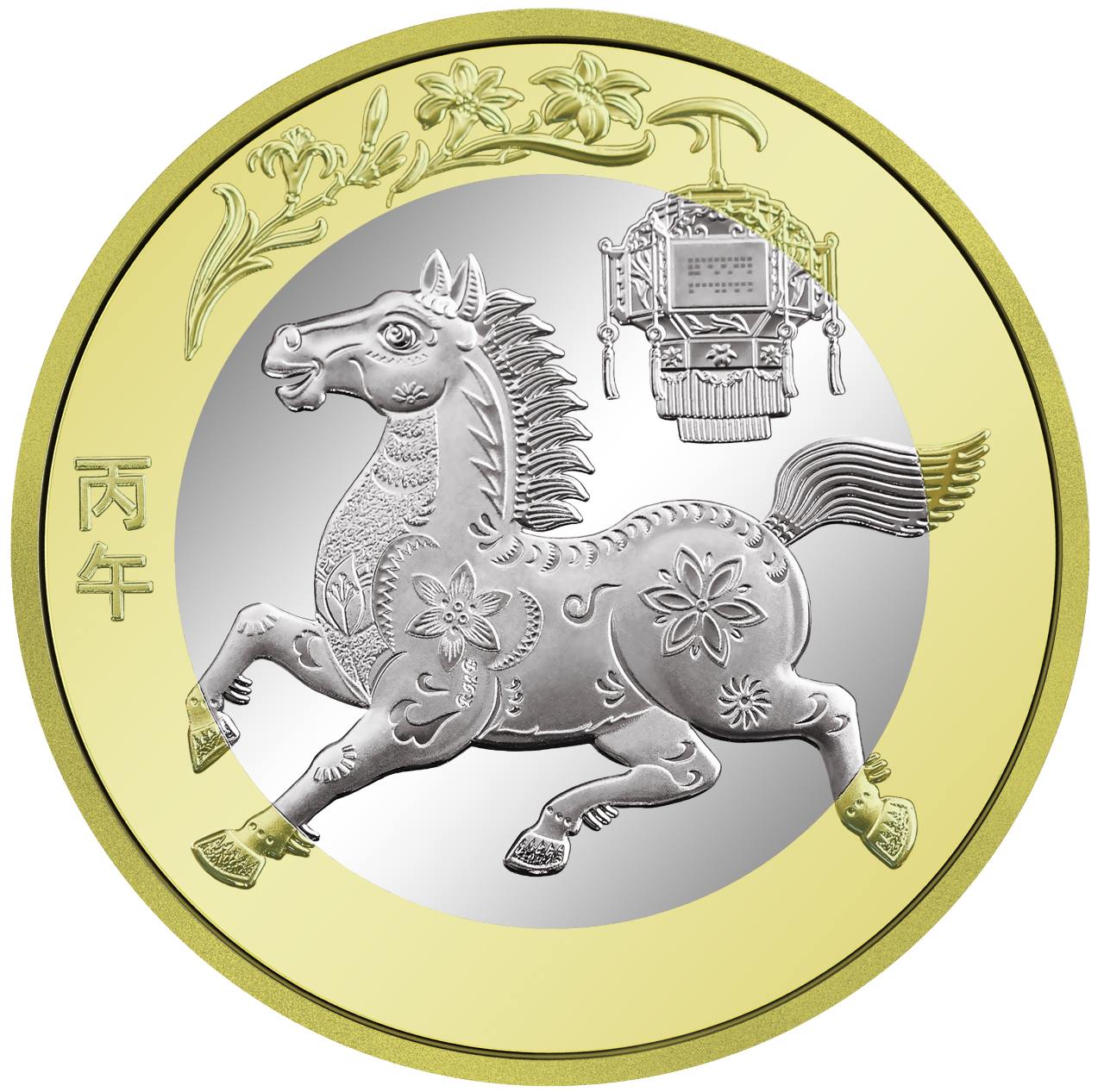 雙色銅合金紀(jì)念幣背面圖案為中國(guó)傳統(tǒng)剪紙藝術(shù)與裝飾年畫元素相結(jié)合的馬形象,襯以花燈和萱草圖案,幣面左側(cè)刊“丙午”字樣。