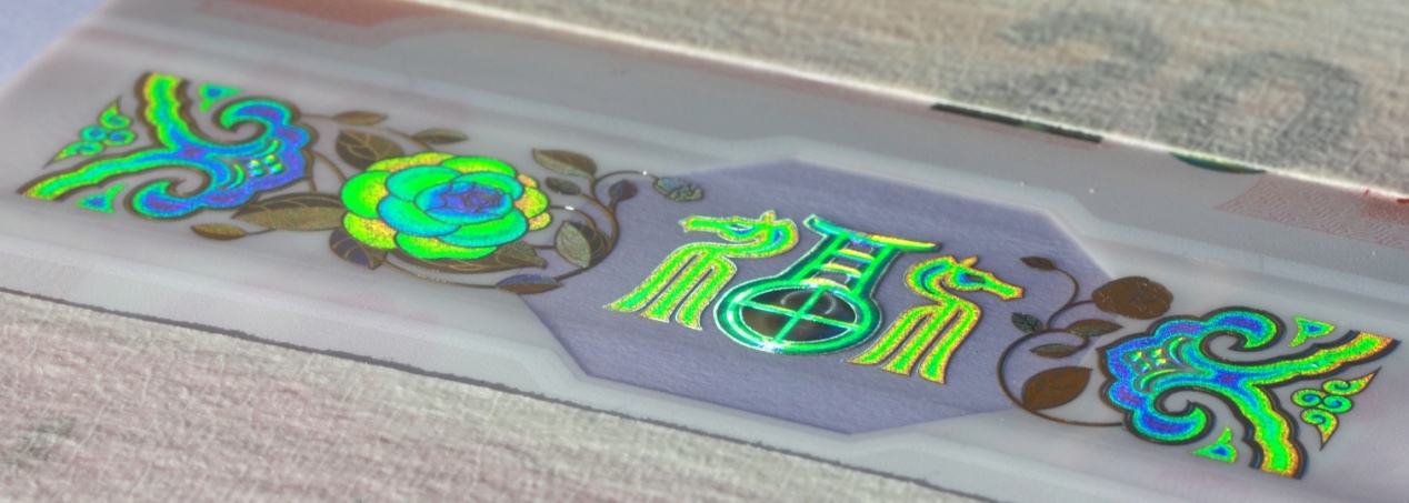 位于票面下方。改變觀察角度,票面正面可見“如意云紋”、“山茶花”與“?!弊纸M成的裝飾紋樣呈現(xiàn)多色動(dòng)感特征?!案!弊窒虏俊疤铩弊謨?nèi)可見立體動(dòng)感高亮圓環(huán)效果。防偽特征效果見圖6。