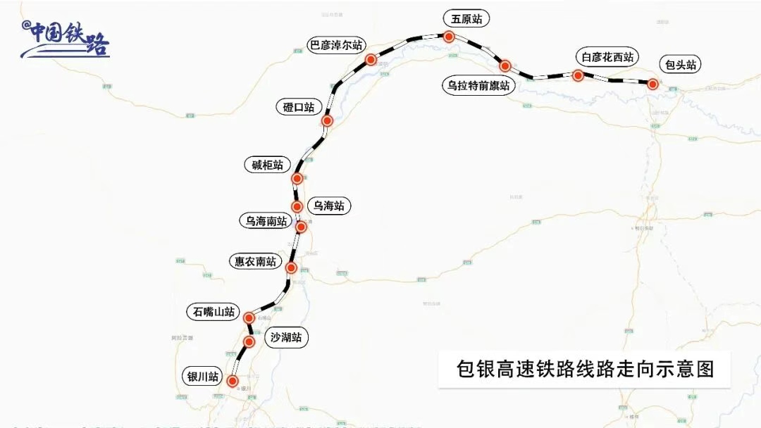 包銀高鐵起自包頭站,經(jīng)內(nèi)蒙古自治區(qū)包頭市、巴彥淖爾市、鄂爾多斯市、烏海市,寧夏回族自治區(qū)石嘴山市、銀川市,接入銀川站,正線全長519公里,設(shè)計時速250公里,實行分段建設(shè),其中,惠農(nóng)至銀川段全長97公里,已于2024年10月開通運(yùn)營,此次開通的包頭至惠農(nóng)段全長422公里,共設(shè)10座車站。