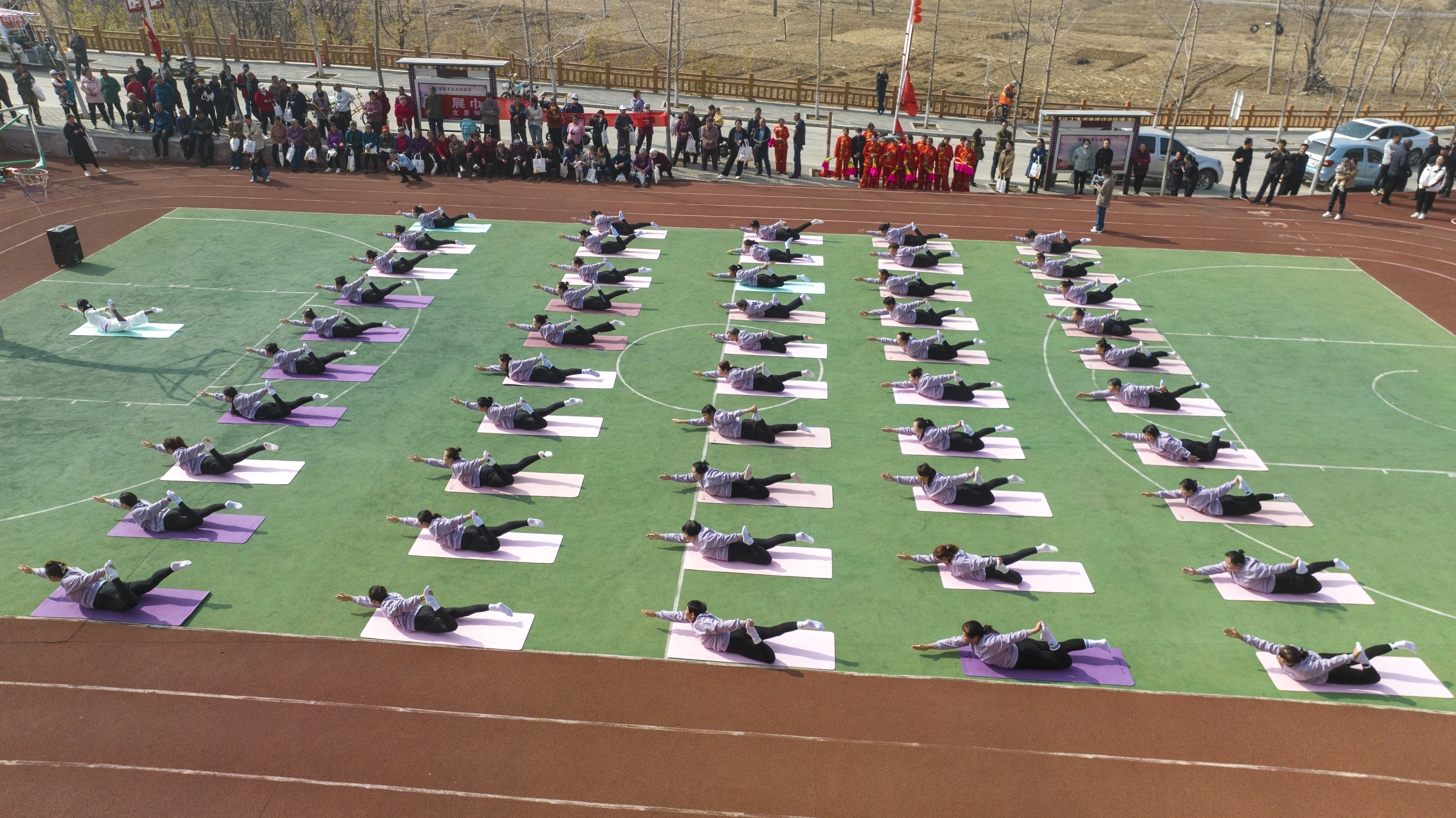 村民在操場練瑜伽。阜平縣委宣傳部供圖