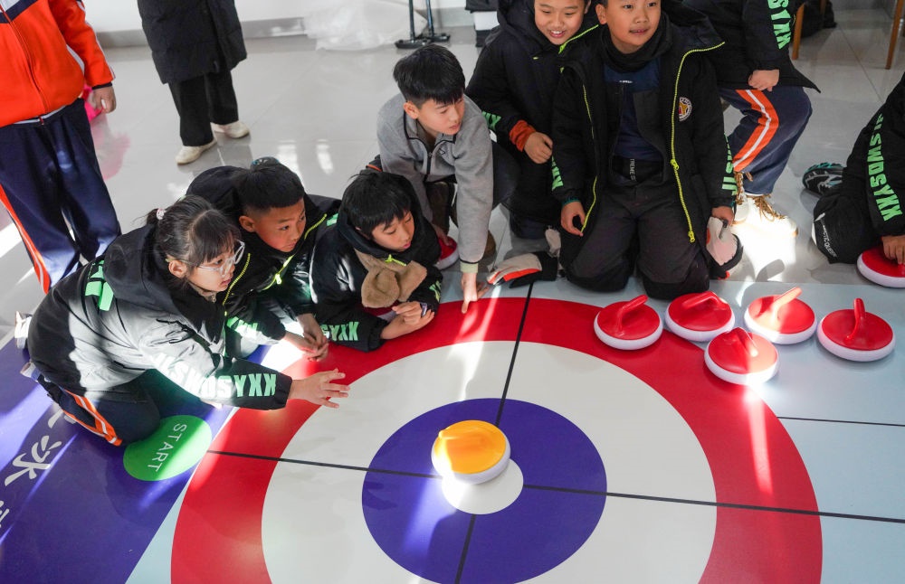 12月3日,吉林市松江東路小學(xué)校學(xué)生在吉林市納美山谷度假區(qū)體驗旱地冰壺。新華社記者 顏麟蘊 攝
