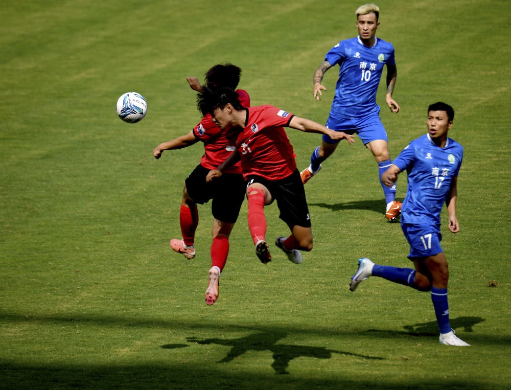 6月14日,球員在“蘇超”淮安隊對陣南京隊的比賽中拼搶。新華社發(fā)(曹政 攝)