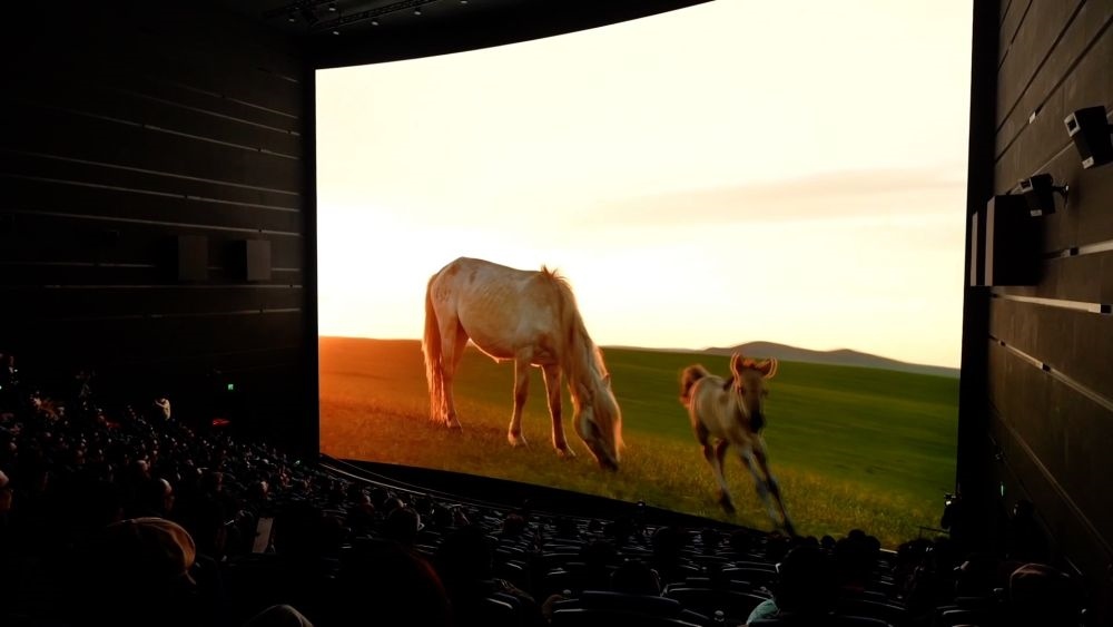 近日,全球首部生肖動物巨幕電影《馬到功成》在上??萍拣^內巨幕影院舉行首映。該屏幕融合4K、3D、高幀率等多項技術,同時也應用了中影集團新一代的CLED透聲屏方案。