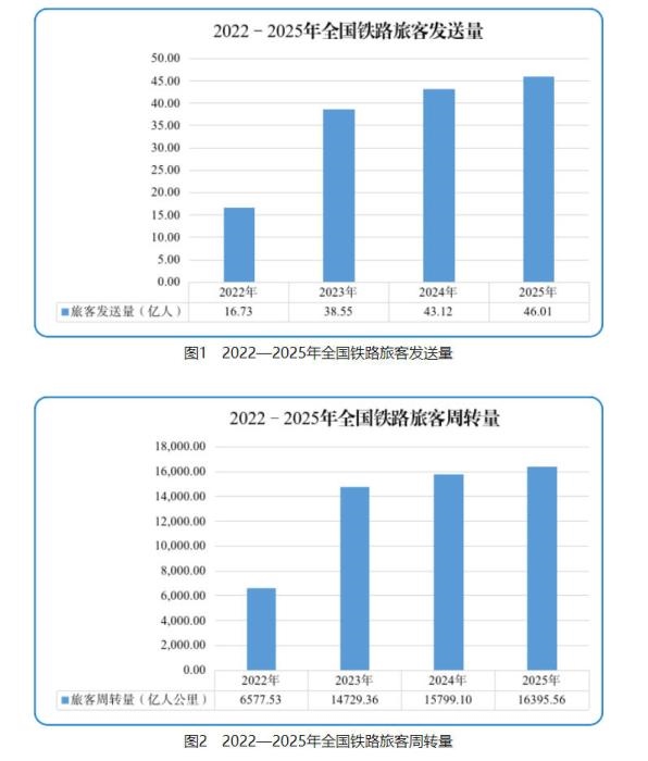 客運(yùn)方面。2025年,全國鐵路累計完成旅客發(fā)送量46.01億人,同比增長6.7%;完成旅客周轉(zhuǎn)量16395.56億人公里,同比增長3.8%。12月份,完成旅客發(fā)送量3.23億人,同比增長8.5%;完成旅客周轉(zhuǎn)量1015.59億人公里,同比增長6.0%。