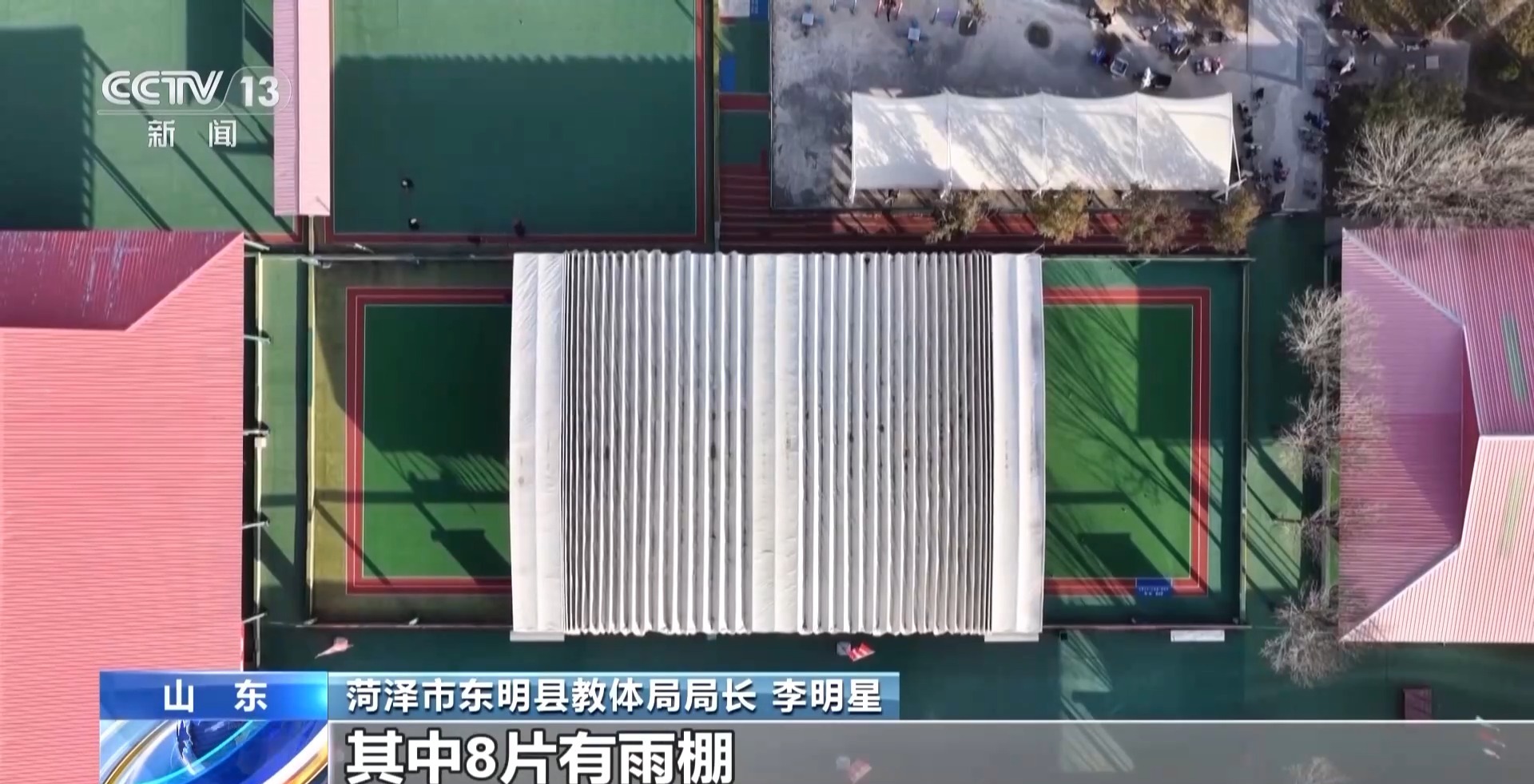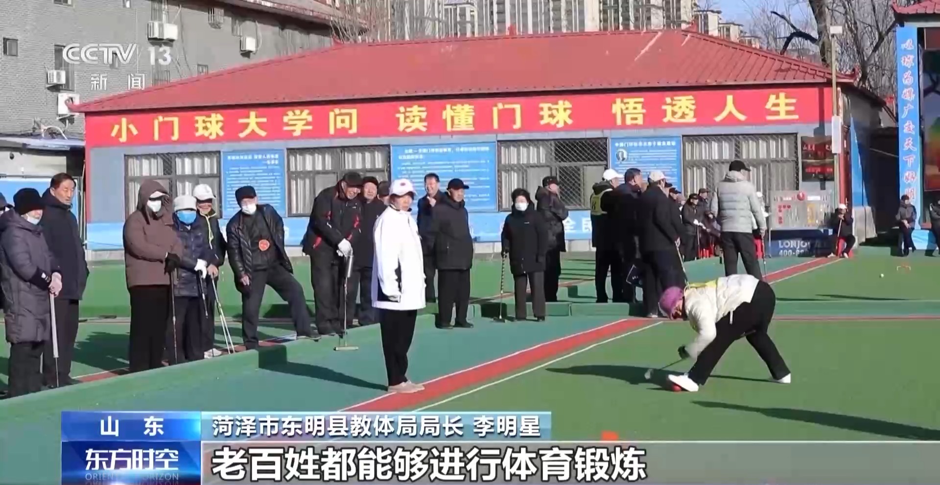 菏澤市東明縣教體局局長 李明星:17片連在一起的標準化門球場,其中8片有雨棚,下雨天、刮風(fēng)天,老百姓都能夠進行體育鍛煉。
