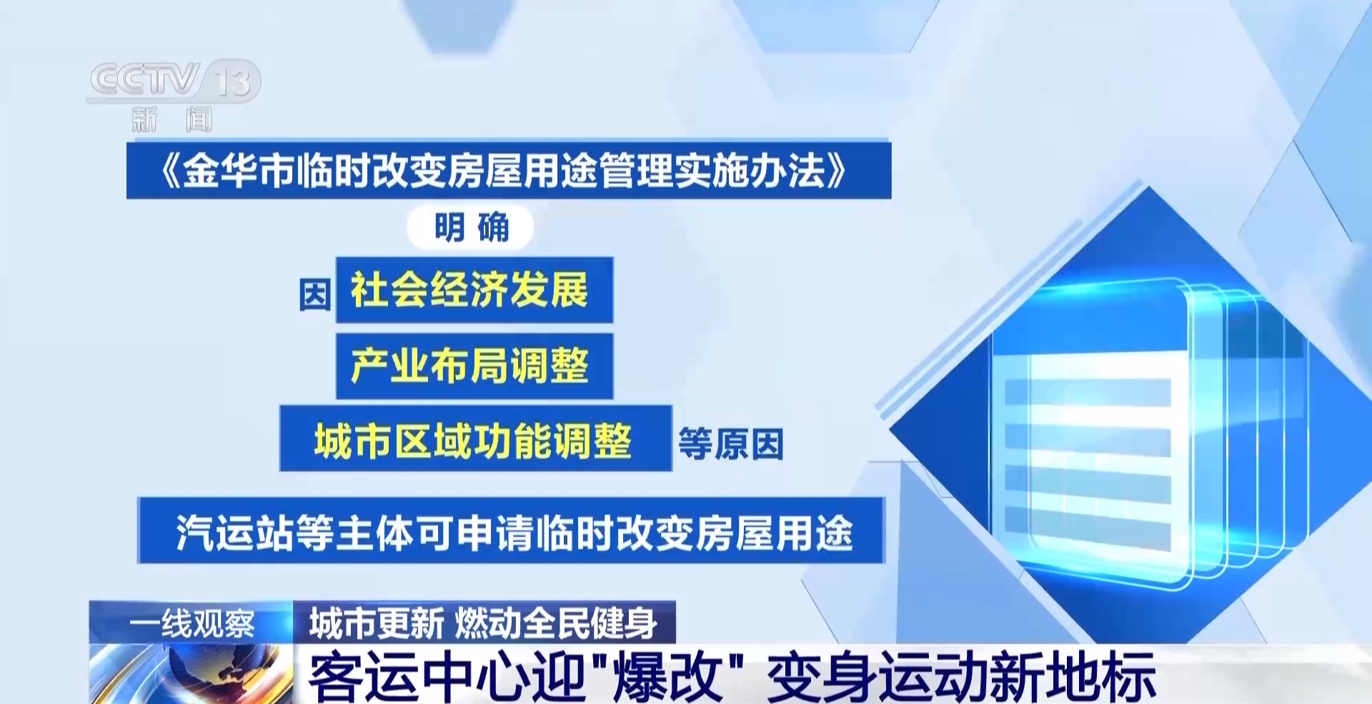 為破解城市更新中業(yè)態(tài)轉(zhuǎn)型難題,金華市出臺了臨時改變房屋用途管理實施辦法,明確因社會經(jīng)濟發(fā)展、產(chǎn)業(yè)布局調(diào)整、城市區(qū)域功能調(diào)整等原因,汽運站等主體可申請臨時改變房屋用途。金華市汽車南站也成為首批受益的城市更新項目。