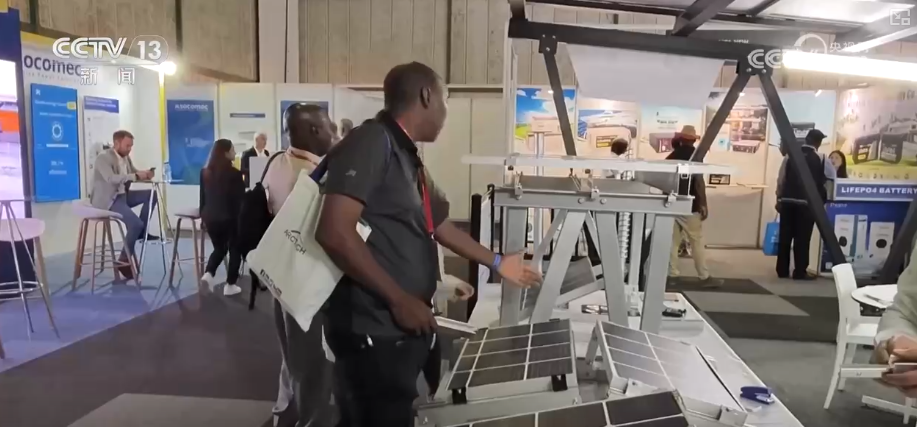 這個新能源產(chǎn)品可以說是非常具有非洲特色,它的上面是兩片光伏板,下面是兩個可以調(diào)整角度的攝像頭,用光伏發(fā)電來支持攝像頭的運行,還有把路燈、攝像頭和光伏結(jié)合在一起的。