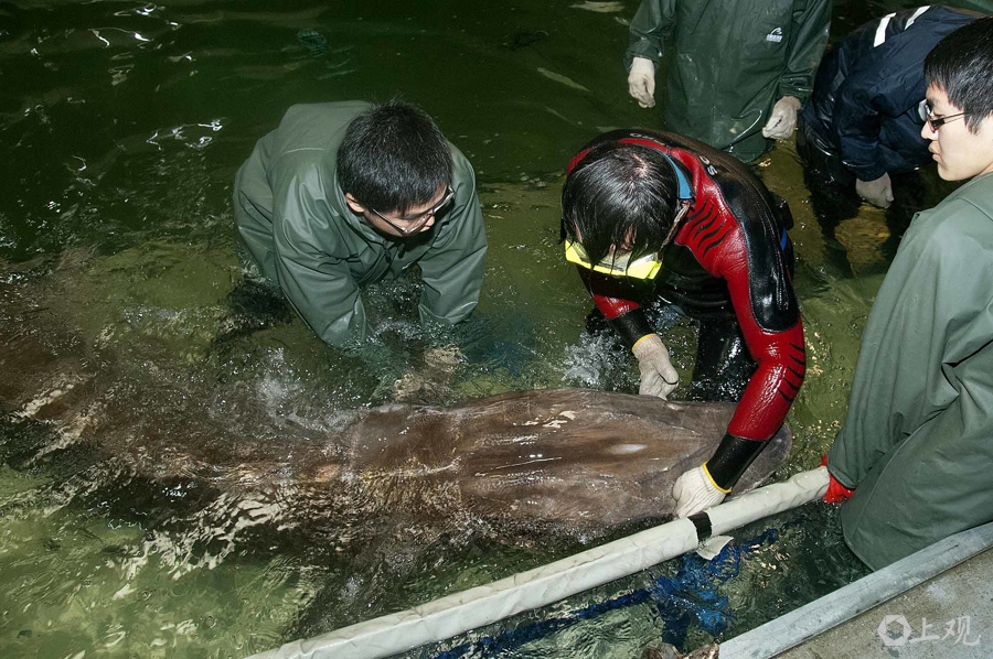 資料圖:2014年3月8日在長(zhǎng)江口搶救的受傷中華鱘
