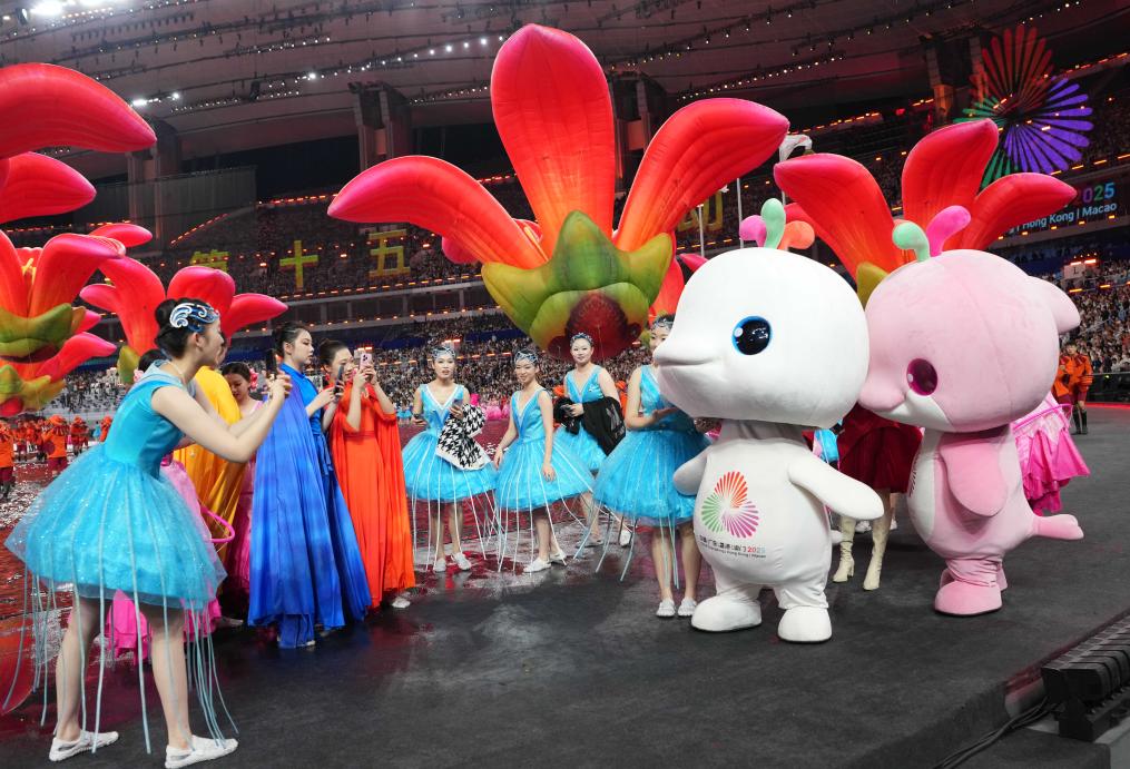 2025年11月9日,演員在第十五屆全國運(yùn)動(dòng)會(huì)開幕式后與吉祥物“喜洋洋”和“樂融融”互動(dòng)。新華社記者 吳魯 攝