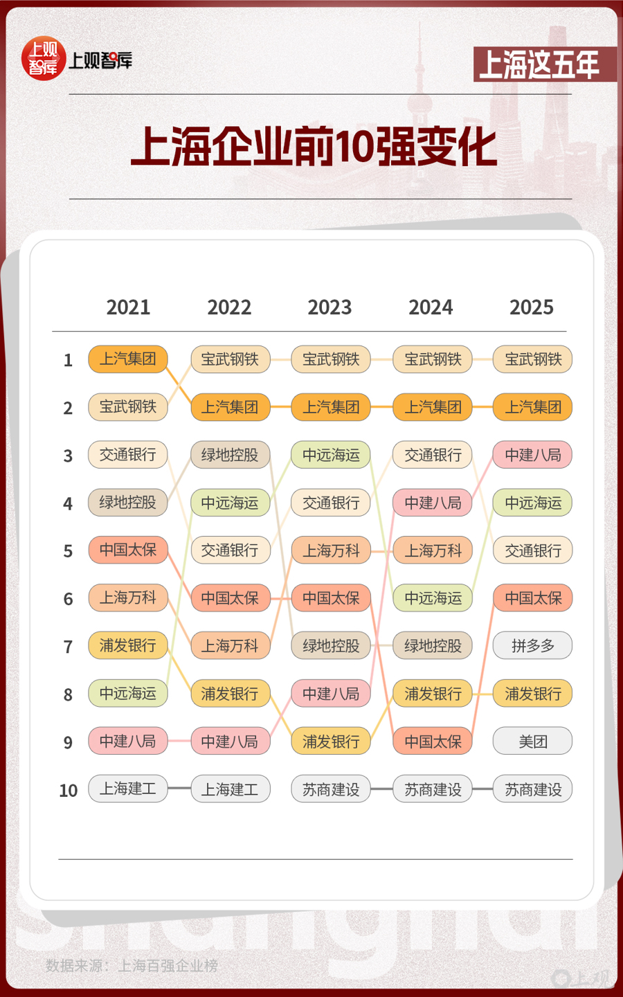 這份由上海市企業(yè)聯(lián)合會、上海市企業(yè)家協(xié)會、上海市經(jīng)濟(jì)團(tuán)體聯(lián)合會和解放日報社共同發(fā)布的榜單,從2021年到2025年,見證了傳統(tǒng)企業(yè)的轉(zhuǎn)型與創(chuàng)新企業(yè)的涌現(xiàn)。在前10強(qiáng)的名單中,制造業(yè)仍然是上海產(chǎn)業(yè)的壓艙石,而房地產(chǎn)、建筑企業(yè)從2021年占比達(dá)40%,到2025年占比降低為20%。互聯(lián)網(wǎng)企業(yè)在2025年沖上前10強(qiáng),并占據(jù)了20%的席位,亮出了上海經(jīng)濟(jì)多元發(fā)展的成績單。