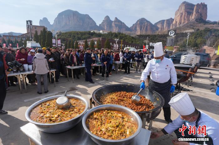 除了非遺展區(qū),在場(chǎng)地一側(cè)安排的“千人百桌宴”也提前烘托出濃濃年味。偌大的場(chǎng)地內(nèi),10人一桌的圓桌分4列排開,近千人同時(shí)用餐,“大燴菜、開花饃,廚師現(xiàn)場(chǎng)制作的飯菜熱氣騰騰,胃口一下就打開了”。