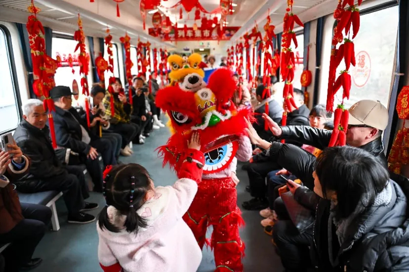 2024年2月23日,5630次列車(chē)上,旅客與舞獅互動(dòng)。當(dāng)日,在元宵節(jié)到來(lái)之際,形式多樣的鬧元宵活動(dòng)在貴州遵義開(kāi)往重慶西的5630次公益性“慢火車(chē)”上舉行,吸引不少旅客參與其中,感受濃濃節(jié)日氣氛。 中新社記者 何蓬磊 攝
