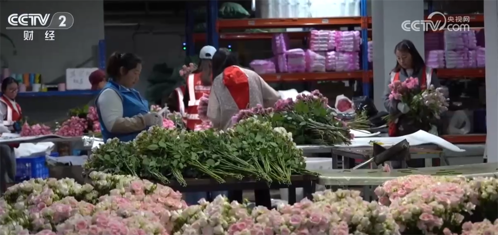 商家介紹,本月出口鮮花的發(fā)貨量是日常的五倍,目前訂單已經(jīng)排到年后。新鮮采摘的鮮花在出口商車(chē)間完成分揀、包裝、保鮮等處理后,由冷鏈送往機(jī)場(chǎng)過(guò)關(guān)出口,整個(gè)流程最快不到20小時(shí)就能完成。