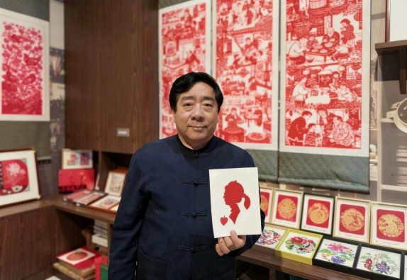 工坊中央,克樹利被層層觀眾圍住,叫好聲此起彼伏。只見他手持一張巴掌大的紅紙,目光在人群中一掃,隨手拉住前排一位扎馬尾辮的小姑娘,手上的剪刀便如游龍般翻飛起來。不畫底稿、不做標記,紅紙在他手中旋轉變形,幾十秒的工夫,一把剪刀開合之間,一張惟妙惟肖的人影剪紙便已成型——俏皮的馬尾辮、抿著嘴的笑臉,甚至連小姑娘頭頂上的發(fā)卡都清晰可見?!跋?!太像了!”圍觀人群中爆發(fā)出一陣熱烈的掌聲,小姑娘捧著剪紙,喜笑顏開。