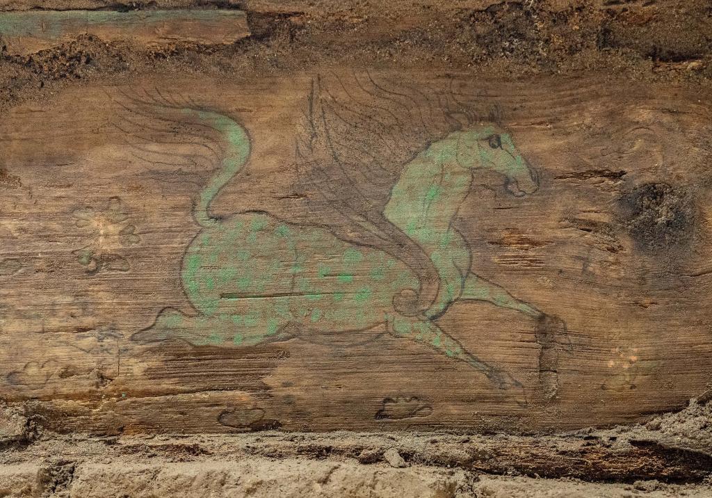 這是木棺座壸門內的彩繪“翼馬”圖案。新華社記者 李賀 攝