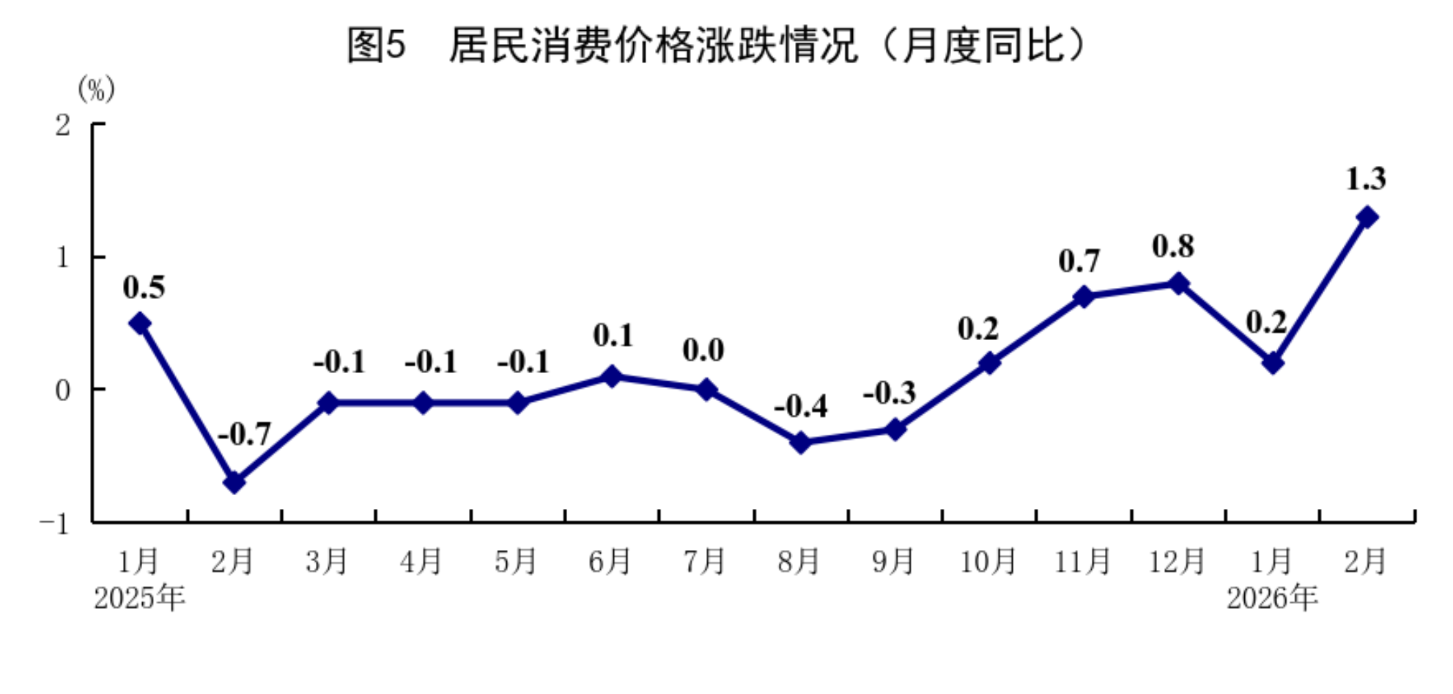 1—2月份,全國(guó)居民消費(fèi)價(jià)格(CPI)同比上漲0.8%,其中1月份上漲0.2%,2月份上漲1.3%。分類(lèi)別看,1—2月份,食品煙酒及在外餐飲價(jià)格同比上漲0.6%,衣著價(jià)格上漲1.9%,居住價(jià)格下降0.1%,生活用品及服務(wù)價(jià)格上漲2.7%,交通通信價(jià)格下降2.1%,教育文化娛樂(lè)價(jià)格上漲1.0%,醫(yī)療保健價(jià)格上漲1.8%,其他用品及服務(wù)價(jià)格上漲14.3%。在食品煙酒及在外餐飲價(jià)格中,豬肉價(jià)格下降11.2%,糧食價(jià)格下降0.2%,鮮果價(jià)格上漲4.5%,鮮菜價(jià)格上漲8.8%??鄢称泛湍茉磧r(jià)格后的核心CPI同比上漲1.3%。從環(huán)比看,1月份,全國(guó)居民消費(fèi)價(jià)格上漲0.2%,2月份上漲1.0%。