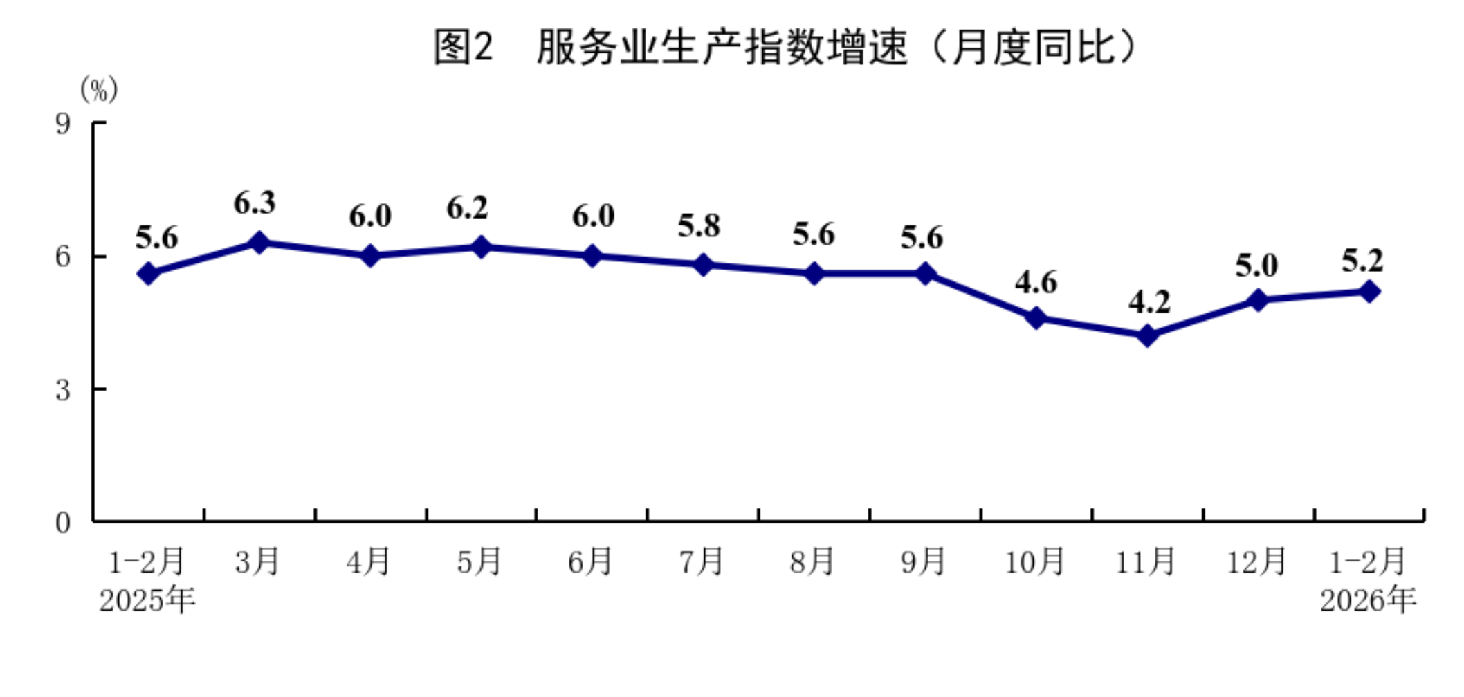 1—2月份,全國(guó)服務(wù)業(yè)生產(chǎn)指數(shù)同比增長(zhǎng)5.2%,比上年12月份加快0.2個(gè)百分點(diǎn)。分行業(yè)看,信息傳輸、軟件和信息技術(shù)服務(wù)業(yè),租賃和商務(wù)服務(wù)業(yè),金融業(yè),交通運(yùn)輸、倉(cāng)儲(chǔ)和郵政業(yè),住宿和餐飲業(yè)生產(chǎn)指數(shù)分別增長(zhǎng)10.1%、8.2%、7.0%、6.3%、5.4%。2月份,服務(wù)業(yè)商務(wù)活動(dòng)指數(shù)為49.7%,比上月上升0.2個(gè)百分點(diǎn);服務(wù)業(yè)業(yè)務(wù)活動(dòng)預(yù)期指數(shù)為55.8%。其中,住宿、餐飲、文化體育娛樂(lè)等行業(yè)商務(wù)活動(dòng)指數(shù)位于60.0%以上高位景氣區(qū)間。