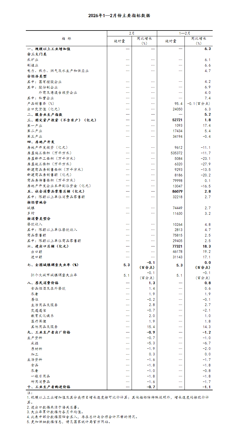 中國(guó)網(wǎng)3月16日訊 國(guó)家統(tǒng)計(jì)局網(wǎng)站3月16日發(fā)布消息,1—2月份,在以習(xí)近平同志為核心的黨中央堅(jiān)強(qiáng)領(lǐng)導(dǎo)下,各地區(qū)各部門(mén)認(rèn)真落實(shí)黨中央、國(guó)務(wù)院決策部署,堅(jiān)持穩(wěn)中求進(jìn)工作總基調(diào),實(shí)施更加積極有為的宏觀(guān)政策,加大逆周期和跨周期調(diào)節(jié),持續(xù)擴(kuò)大內(nèi)需、優(yōu)化供給,做優(yōu)增量、盤(pán)活存量,生產(chǎn)供給增長(zhǎng)加快,市場(chǎng)需求穩(wěn)中有升,就業(yè)物價(jià)總體穩(wěn)定,新質(zhì)生產(chǎn)力成長(zhǎng)壯大,經(jīng)濟(jì)運(yùn)行起步有力,實(shí)現(xiàn)良好開(kāi)局。
