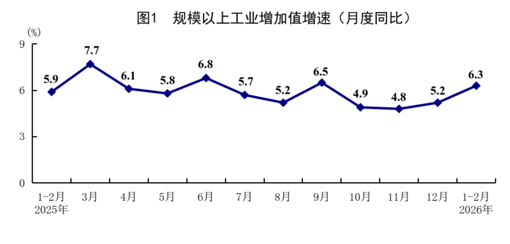 1—2月份,全國(guó)規(guī)模以上工業(yè)增加值同比增長(zhǎng)6.3%,比上年12月份加快1.1個(gè)百分點(diǎn)。分三大門(mén)類(lèi)看,采礦業(yè)增加值同比增長(zhǎng)6.1%,制造業(yè)增長(zhǎng)6.6%,電力、熱力、燃?xì)饧八a(chǎn)和供應(yīng)業(yè)增長(zhǎng)4.7%。裝備制造業(yè)增加值同比增長(zhǎng)9.3%,高技術(shù)制造業(yè)增加值增長(zhǎng)13.1%,分別快于全部規(guī)模以上工業(yè)增加值3.0和6.8個(gè)百分點(diǎn)。分經(jīng)濟(jì)類(lèi)型看,國(guó)有控股企業(yè)增加值同比增長(zhǎng)4.2%;股份制企業(yè)增長(zhǎng)6.9%,外商及港澳臺(tái)投資企業(yè)增長(zhǎng)4.0%;私營(yíng)企業(yè)增長(zhǎng)7.4%。分產(chǎn)品看,3D打印設(shè)備、鋰離子電池、工業(yè)機(jī)器人產(chǎn)品產(chǎn)量同比分別增長(zhǎng)54.1%、42.6%、31.1%。從環(huán)比看,2月份規(guī)模以上工業(yè)增加值比上月增長(zhǎng)0.83%。2月份,制造業(yè)采購(gòu)經(jīng)理指數(shù)為49.0%;企業(yè)生產(chǎn)經(jīng)營(yíng)活動(dòng)預(yù)期指數(shù)為53.2%,比上月上升0.6個(gè)百分點(diǎn)。