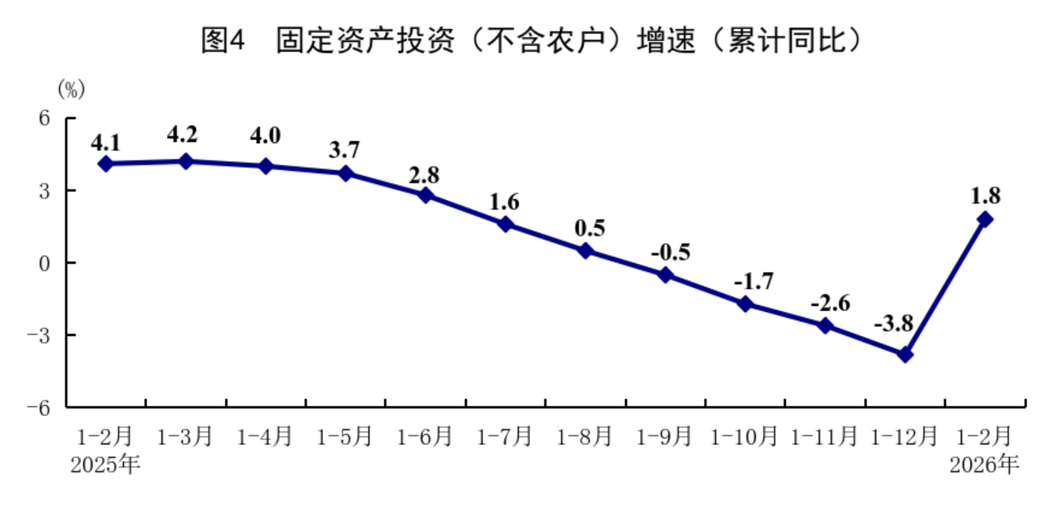 1—2月份,全國(guó)固定資產(chǎn)投資(不含農(nóng)戶(hù))52721億元,同比增長(zhǎng)1.8%,上年全年為下降3.8%;扣除房地產(chǎn)開(kāi)發(fā)投資,全國(guó)固定資產(chǎn)投資增長(zhǎng)5.2%。分領(lǐng)域看,基礎(chǔ)設(shè)施投資同比增長(zhǎng)11.4%,制造業(yè)投資增長(zhǎng)3.1%,房地產(chǎn)開(kāi)發(fā)投資下降11.1%。全國(guó)新建商品房銷(xiāo)售面積9293萬(wàn)平方米,同比下降13.5%;新建商品房銷(xiāo)售額8186億元,下降20.2%。分產(chǎn)業(yè)看,第一產(chǎn)業(yè)投資同比增長(zhǎng)17.4%,第二產(chǎn)業(yè)投資增長(zhǎng)5.4%,第三產(chǎn)業(yè)投資下降0.4%。民間投資同比下降2.6%,降幅比上年全年收窄3.8個(gè)百分點(diǎn);扣除房地產(chǎn)開(kāi)發(fā)投資,民間投資增長(zhǎng)1.0%。高技術(shù)產(chǎn)業(yè)投資同比增長(zhǎng)5.1%,其中航空、航天器及設(shè)備制造業(yè),研發(fā)與設(shè)計(jì)服務(wù)業(yè),信息服務(wù)業(yè)投資分別增長(zhǎng)20.2%、20.6%、16.5%。從環(huán)比看,2月份固定資產(chǎn)投資(不含農(nóng)戶(hù))比上月增長(zhǎng)0.39%。