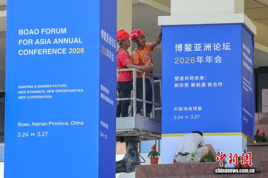 3月17日,博鰲亞洲論壇2026年年會(huì)各項(xiàng)籌備工作正有序推進(jìn),海南博鰲街頭的盛會(huì)氛圍日漸濃厚。以“塑造共同未來(lái):新形勢(shì)、新機(jī)遇、新合作”為主題的博鰲亞洲論壇2026年年會(huì)將于3月24日至27日在海南博鰲召開。圖為工作人員在博鰲亞洲論壇永久會(huì)址安裝年會(huì)主題展板。中新社記者 駱云飛 攝