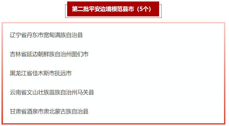 5個第二批平安邊境模范縣市名單。(國家移民管理局微信公眾號截圖)