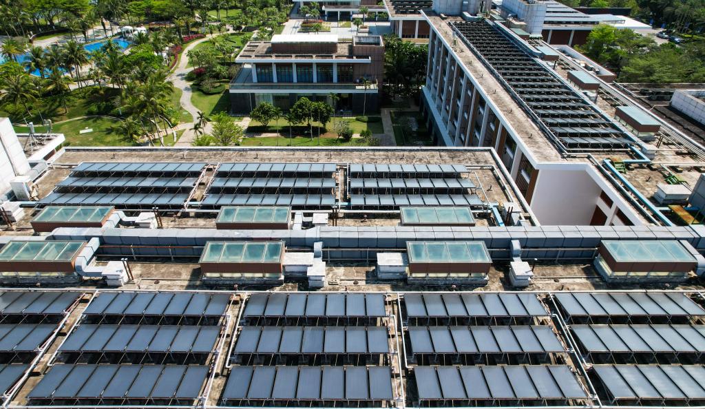 在博鰲零碳示范區(qū)拍攝的博鰲亞洲論壇國(guó)際會(huì)議中心和博鰲亞洲論壇大酒店屋頂?shù)墓夥O(shè)備(3月19日攝,無(wú)人機(jī)照片)。
