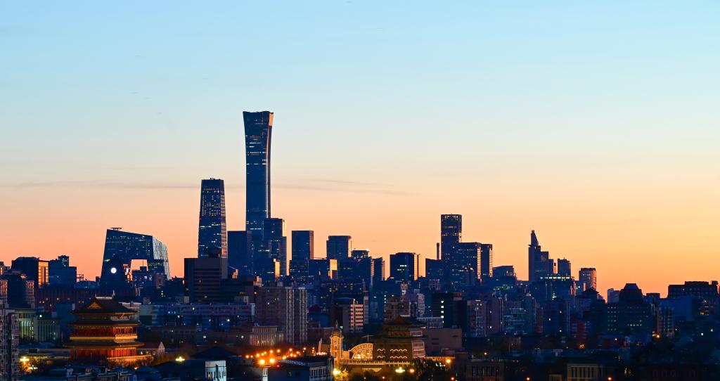 2025年11月27日清晨拍攝的北京正陽門城樓、正陽門箭樓和遠處的CBD建筑群。新華社記者 陳曄華 攝